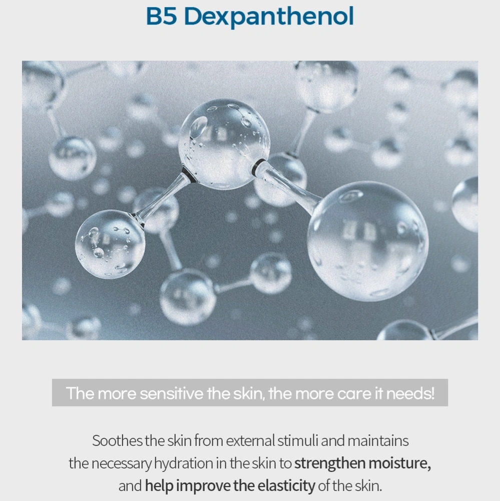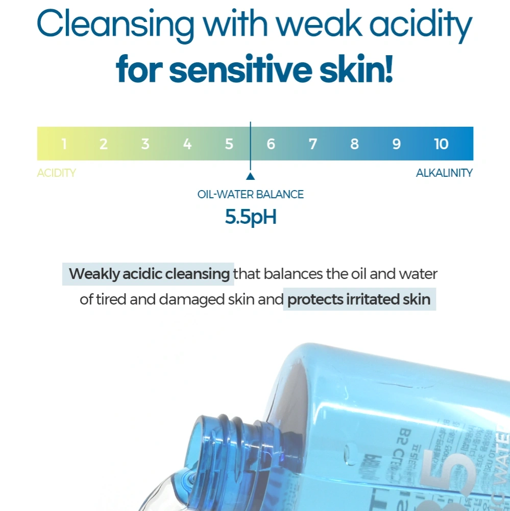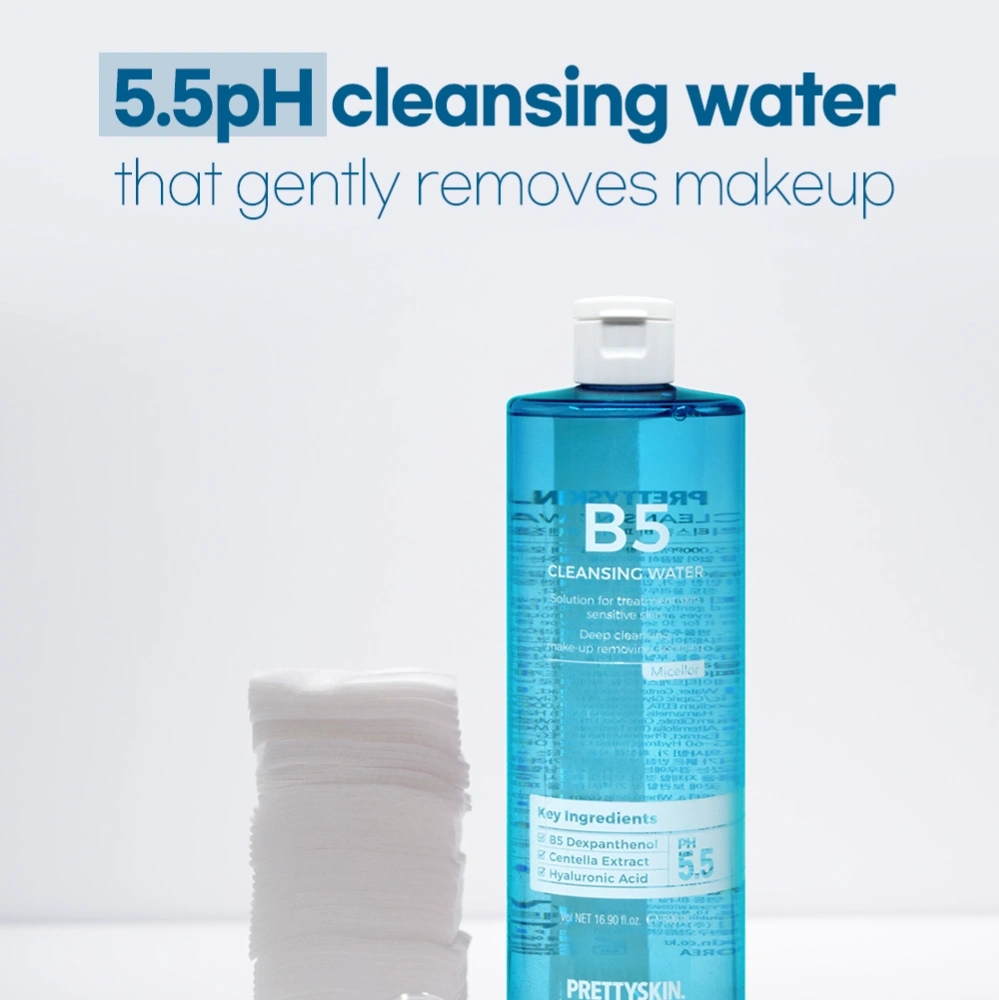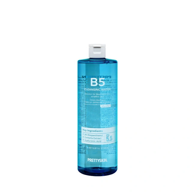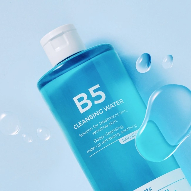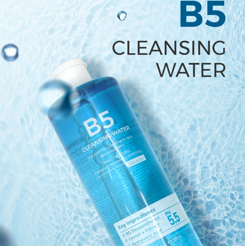 B5 Cleansing Water is a gentle, no-rinse cleanser that effectively removes makeup, dirt, and impurities while hydrating and soothing the skin with Vitamin B5.