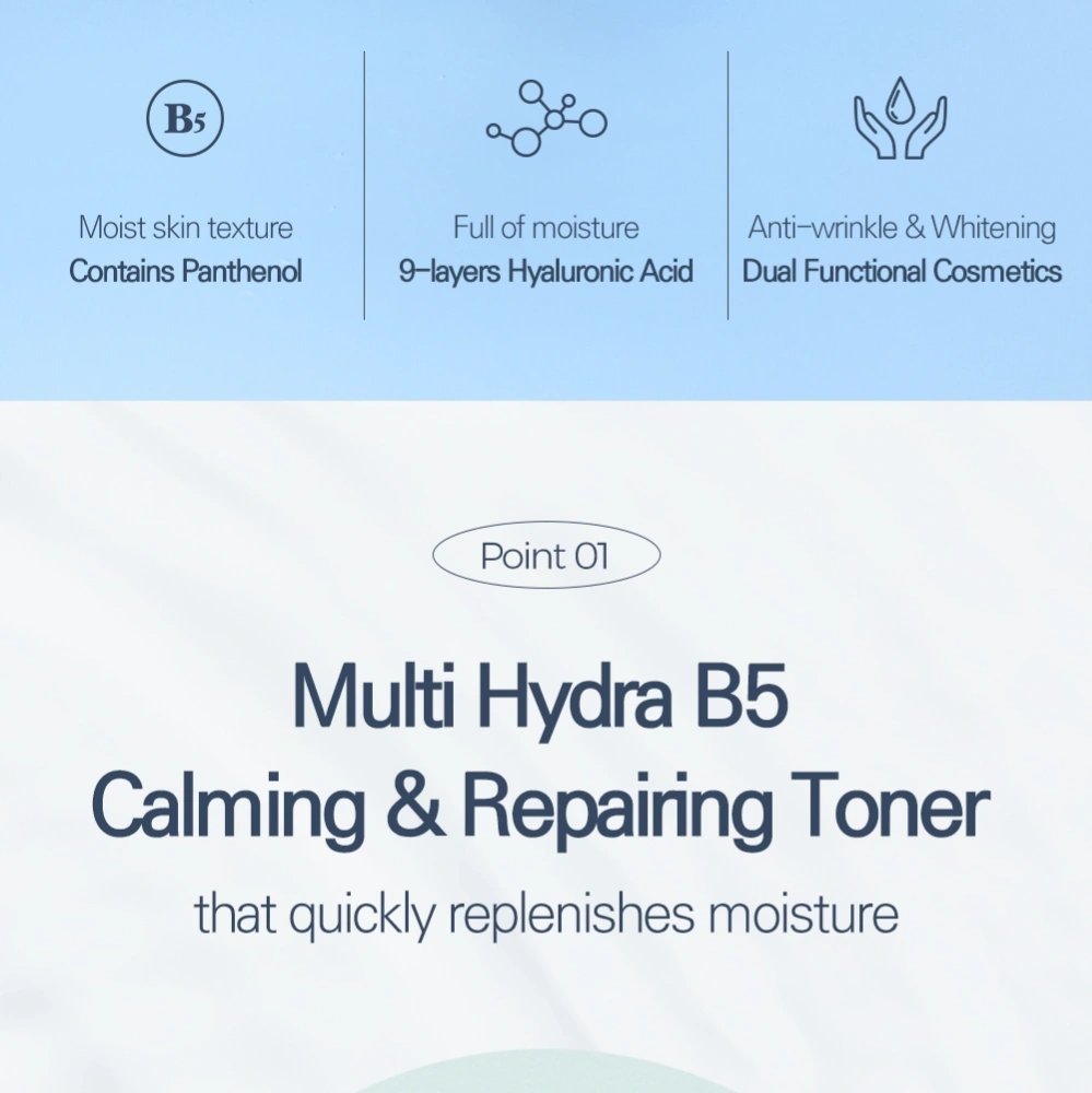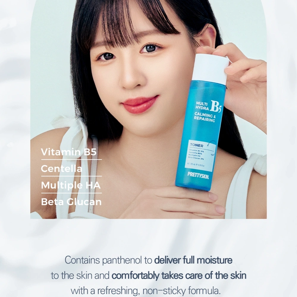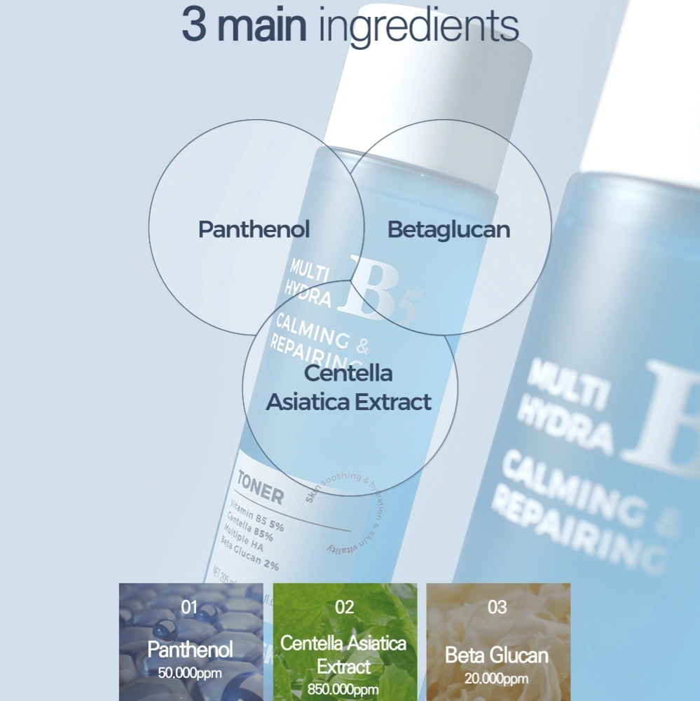 A soothing and hydrating toner formulated with Vitamin B5, Centella Asiatica, and Multi Hyaluronic Acid to calm irritation, repair the skin barrier, and deliver deep, long-lasting moisture. Lightweight, fast-absorbing, and perfect for sensitive or dehydrated skin.