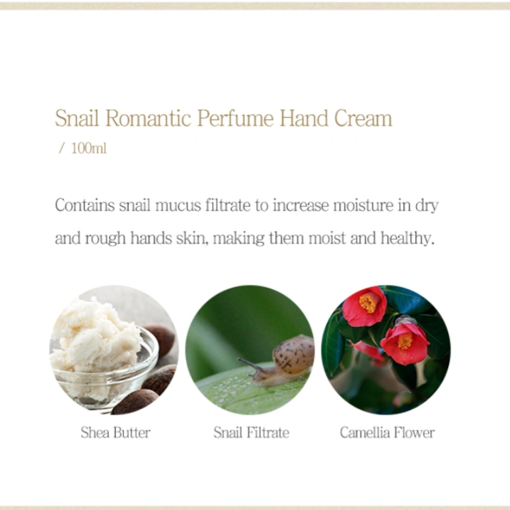 Contains snail mucus filtrate to increase moisture in dry and rough hands skin, manage them moist and healthy.